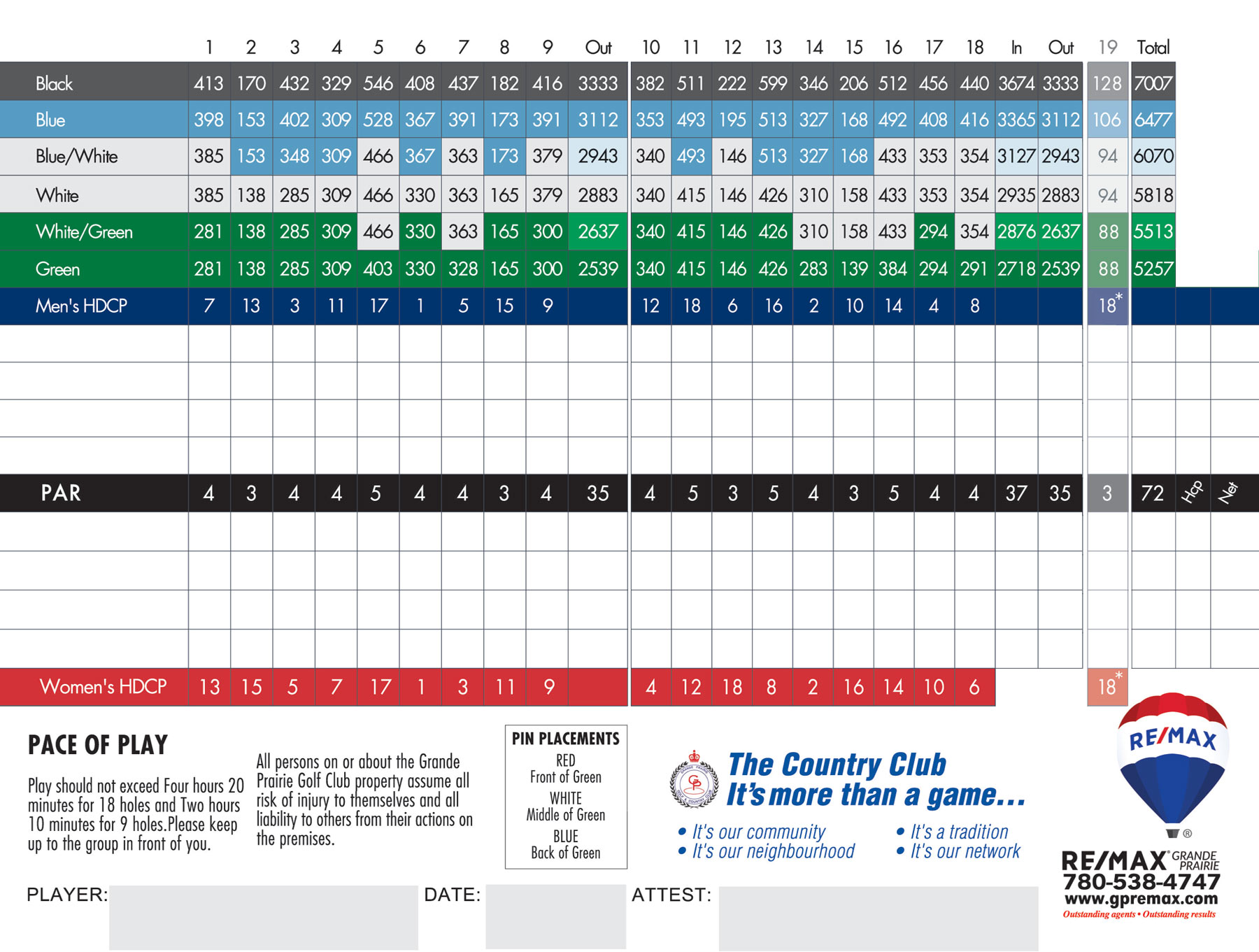 The Grande Prairie Golf & Country Club has been at its current location since 1968. The course has become a favourite for many and has been enjoyed by golfers from all over Alberta and British Columbia for over 50 years. The Country Club offers golfers at every level of challenge a wide variety of play with great characteristics around every corner.  Its manicured fairways, mature trees, and pristine greens help to provide the finest golf experience in the Peace Country.